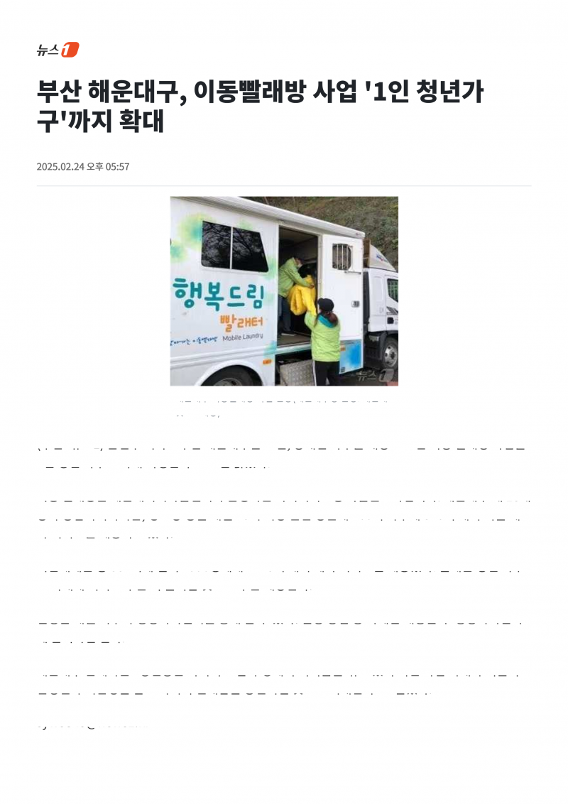 부산 해운대구, 이동빨래방 사업 '1인 청년가구'까지 확대 페이지 정보 작성자 최고관리자 작성일26-02-19 14:47 조회122회 관련링크 https://www.news1.kr/local/busan-gyeongnam/5699858 76회 연결 이전글 다음글 목록 답변 본문 이전글 다음글 목록 답변